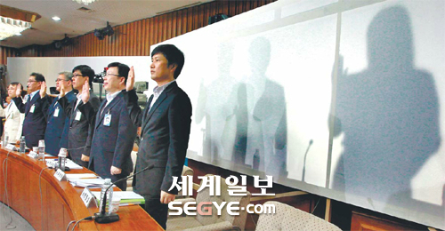 | 가림막 증인 선서 19일 오전 국가정보원 댓글 의혹 사건 등의 진상 규명을 위한 국회 국정조사특위 청문회에 증인으로 출석한 경찰관과 전직 국정원 직원들(앞줄) 및 현직 국정원 직원들(가림막 뒤)이 증인신문에 앞서 선서를 하고 있다. 남정탁 기자 |