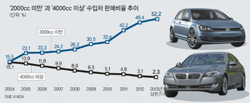 20일 한국수입자동차협회(KAIDA)에 따르면 2004년 배기량 ‘2000㏄ 미만’ 차량과 ‘4000㏄ 이상’ 차량은 각각 전체 판매량의 15.5%, 15.1%를 차지했다. 당시 배기량별 판매율은 ‘2000∼3000㏄’가 전체의 40.8%였고, ‘3000∼4000㏄’도 28.6%나 됐다. 10년 전만 해도 ‘수입차=고배기량’이라는 공식이 통했다는 얘기다.