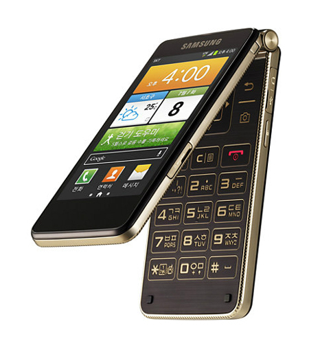 ‘갤럭시 골든’은 접었다 폈다 하면서 동시에 쓸 수 있는 스마트폰이다. 이 제품은 폴더 휴대전화처럼 접었을 때는 겉으로 드러나는 화면을 통해 스마트폰을 쓰듯 터치할 수 있다. 활짝 폈을 때는 내부의 키패드로 문자 메시지를 보낼 수 있다.