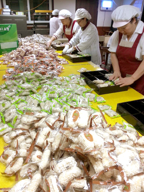 | 지난달 30일 경기 가평군 청평면의 ‘가평잣한과’ 공장에서 직원들이 능숙한 손놀림으로 우체국 쇼핑을 통해 한가위 선물로 나갈 선물상자에 유과를 채우고 있다. 우정사업본부 제공 |