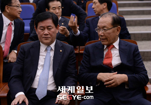 | 새누리당 황우여 대표(앞줄 오른쪽)가 2일 국회에서 열린 의원총회에 참석해 최경환 원내대표(왼쪽)와 이야기하고 있다. 허정호 기자 |