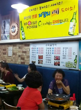 | ◇12일 ‘부산소주 사랑’ 홍보 캠페인 현수막이 내걸린 자갈치시장 내 한 업소의 풍경 |