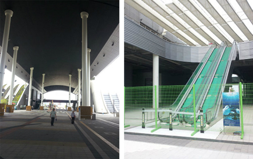 | 여수박람회 당시 LED조명 영상으로 방문객의 눈길을 사로잡은 디지털 갤러리 시설은 폐막 이후 멈춰 있다.(왼쪽) 엑스포해양공원으로 재개장한 이후에도 여수박람회 전시관 시설 대부분에 출입을 막는 펜스가 설치돼 있다. |