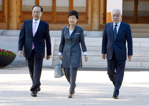 | 제 갈 길 향해… 박근혜 대통령이 16일 여의도 국회 사랑재에서 열린 여야 대표와의 3자회담을 마치고 굳은 표정으로 새누리당 황우여(왼쪽), 민주당 김한길 대표와 함께 회담장을 나서고 있다. 청와대사진기자단 |