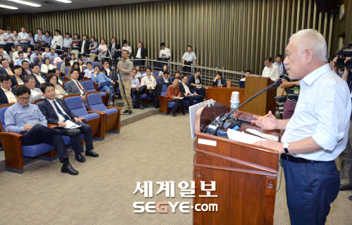 | 민주당 김한길 대표가 16일 박근혜 대통령과 새누리당 황우여 대표와의 3자회담을 마친 뒤 국회에서 열린 의원총회에서 회담 내용을 설명하고 있다. 남제현 기자 |