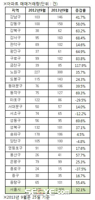 한편, 9월 한달간 서울시에서 거래량이 가장 많았던 지역은 노원구로 308건이 이뤄졌고, 이어 ▲송파구 186건 ▲구로구 182건 ▲성북구 181건 ▲강서구 160건 ▲강동구 158건 등의 순으로 많았다.