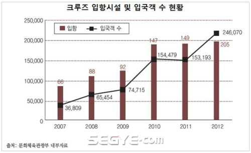 27일 문화체육관광부에 따르면 세계 크루즈 승객 증가율이 연평균 7.7%를 기록하는 등 지속적인 성장세를 유지하고 있다. 국내 크루즈 시장 역시 2007년엔 3만6809명에 불과했지만 2012년 기준 6.7배 증가한 24만6070명의 외국인 관광객이 입국했을 정도로 급성장했다.