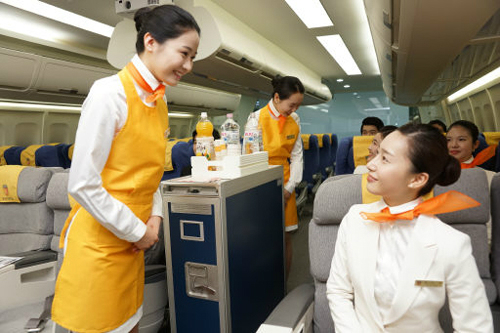 | 2013년 신설된 부천대 항공서비스과는 국내 최연소 VVIP 전용기 사무장인 김모란씨를 교수로 영입하는 등 학과 경쟁력 강화에 노력을 기울이고 있다. 사진은 항공서비스과 학생들이 모형 기내에서 실습을 하는 장면. 부천대 제공 |