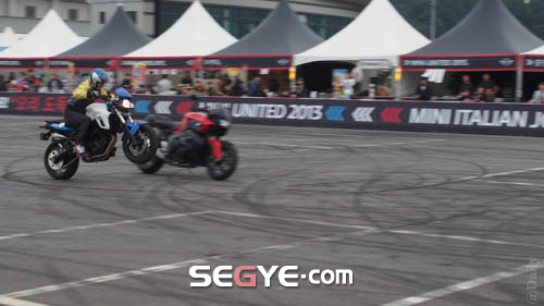 또 다른 무대에서는 MINI와 같은 BMW 그룹의 계열사 모토라드가 화려한 퍼포먼스를 선보였다. 800cc급 바이크 F800R을 탄 2명의 라이더가 묘기를 선보였다. 앞바퀴를 들고 달려오더니 뒷바퀴를 헛돌리며 미끄러지듯 빠져나간다. 깜짝 놀랄 묘기가 이어질 때마다 행사를 지켜보던 어른들은 물론 아이들의 기립박수까지 이어졌다.
