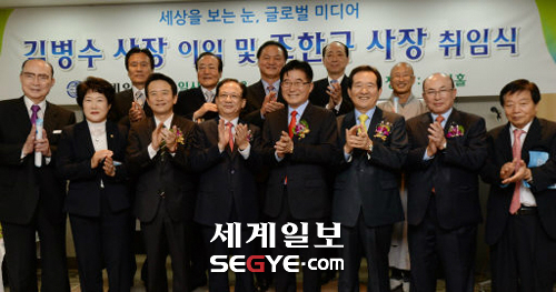 | 1일 서울 종로구 세계일보 유니홀에서 열린 본사 사장 이·취임식에 참석한 주요 인사들이 기념촬영을 하고 있다. 앞줄 왼쪽부터 박보희 한국문화재단 이사장, 최경애 종로구의원, 남경필 새누리당 의원, 김병수 전 사장, 조한규 사장, 정세균 민주당 의원, 박노희 통일그룹 이사장, 설용수 남북통일운동국민연합 회장. 뒷줄 왼쪽부터 이동한 한국종교협의회 회장, 유종관 전 세계일보 사장, 양창식 세계평화통일가정연합 한국총회장, 김효율 선교회재단 부이사장, 태고종 문사부장 성인 스님. 김범준 기자 |