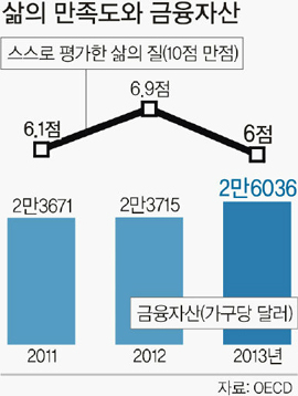 세계일보가 6일 OECD의 BLI 통계를 분석한 결과 우리나라 국민의 가구당 가처분소득(달러환산)은 2011년 1만6254달러, 2012년 1만6570달러, 2013년 1만7337달러로 꾸준히 늘어났다. 가계금융자산 역시 2011년 2만3671달러, 2012년 2만3715달러, 2013년 2만6036달러로 증가했다.