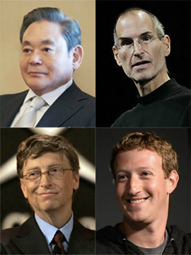 | 부자들 가운데 상위 0.1%에 해당하는 극소수 사람들은 탐욕스럽기도 하지만 더 열심히 일하고 고민한다는 측면도 있다. 사진은 왼쪽위부터 시계 방향으로 이건희, 故 스티브 잡스, 마크 저커버그, 빌 게이츠. |