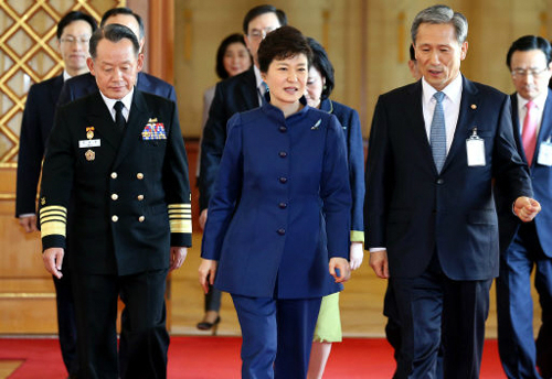 | 박근혜 대통령이 16일 오후 청와대에서 보직신고를 받은 최윤희 신임 합참의장(왼쪽)과 김관진 국방장관(오른쪽) 등과 함께 환담 장소로 걸어가고 있다. 청와대사진기자단 |