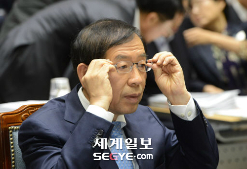 | 박원순 서울시장이 18일 서울시청에서 열린 국회 국토교통위원회 서울시 국정감사에서 안경을 고쳐쓰고 있다. 이제원 기자 |