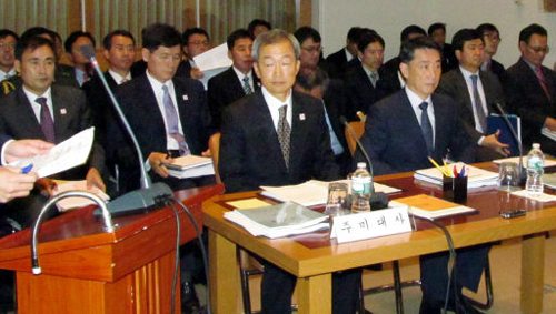 | 뉴욕 현지서 감사 안호영 주미 대사(앞줄 왼쪽)와 오준 주유엔대표부 대사(앞줄 오른쪽)가 17일(현지시간) 미국 뉴욕 주유엔대표부에서 열린 국회 외교통일위원회의 주미대사관·주유엔대표부 국정감사에 출석해 의원들 질의를 듣고 있다. 뉴욕=연합뉴스 |