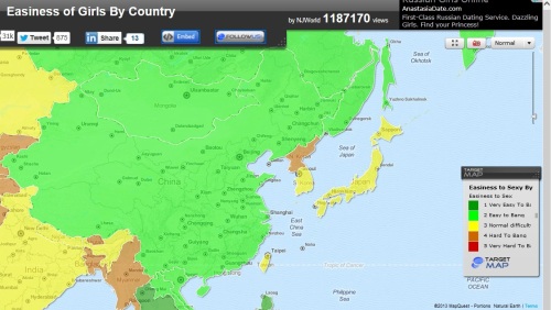 이 지도에서는 빨강, 주황, 노란, 연두, 초록 등 5가지 색깔로 각 나라에서 여성꼬시기 난이도 수준을 표시돼 있다. 각 색깔은 순서대로 '매우 어렵다', '어렵다', '평균 정도', '쉽다','매우 쉽다' 등이다.