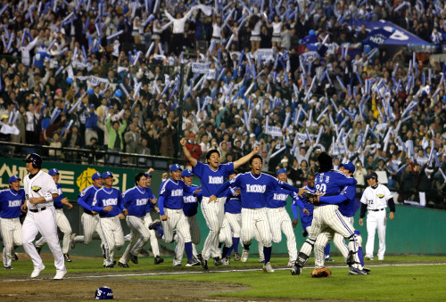 | 삼성 선수들이 2005년 10월19일 두산과의 한국시리즈 4차전에서 이겨 4연승으로 챔피언에 등극한 뒤 그라운드로 뛰쳐나와 환호하며 기쁨을 만끽하고 있다. 세계일보 자료사진 |