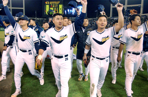 | 두산 선수들이 2001년 10월16일 잠실구장에서 펼쳐진 현대 유니콘스와의 플레이오프 4차전에서 이겨 한국시리즈행을 결정지은 뒤 모자를 벗어들고 그라운드를 돌며 관중들의 환호에 답례하고 있다. 두산은 2001년 한국시리즈에서 삼성마저 따돌리고 우승 트로피를 들어올렸다. 세계일보 자료사진 |