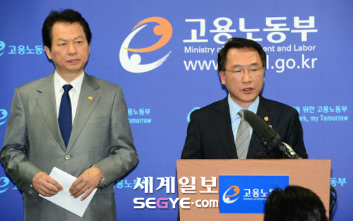 | 방하남 고용노동부 장관(오른쪽)과 서남수 교육부 장관이 24일 경기도 정부과천청사에서 공동기자회견을 갖고 정부의 전교조 법외노조 통보 배경을 설명하고 있다. 남정탁 기자 |