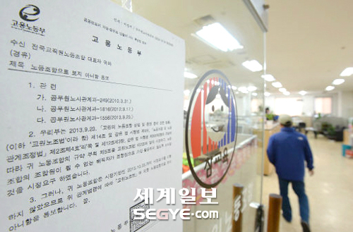 | 이제부터 ‘법외노조’ 고용노동부가 전국교직원노동조합에 ‘법외노조’ 통보를 한 24일 오후 서울 영등포구 전교조 사무실 출입문에 ‘노동조합으로 보지 아니함 통보’라는 제목의 고용부 장관 명의 공문이 부착돼 있다. 법외노조가 된 전교조는 단체협약체결권을 상실하고 노동조합이라는 명칭도 공식적으로 사용하지 못하게 됐다. 김범준 기자 |