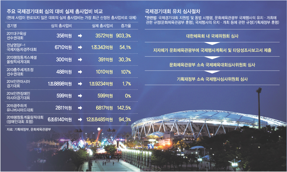 국제경기대회를 유치하려면 ▲대한체육회 내 국제위원회 심사 ▲문화체육관광부에 국제행사계획서 및 타당성조사 보고서 제출 ▲문화부 소속 국제체육대회심사위원회 심사 ▲기재부 소속 국제행사심사위원회 심사 과정을 거쳐야 한다. 이 가운데 지자체가 문화부에 제출하는 타당성조사 보고서가 실제 사업비를 늘어나게 하는 주범이다. 경제적 타당성 분석에 간접적 편익까지 포함하는 등 경제적 타당성을 과장해 산출하고 있기 때문이다. 나라 곳간을 책임지는 기재부가 한 차례 심사하는 절차가 있지만 이 역시 제대로 힘을 쓰지 못한다. 정해진 예산을 쓰는 게 아니라 ‘특별법’을 통해 지원하게 돼 기재부 심사절차가 생략되는 일이 잦다.