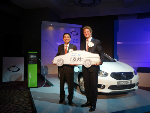 르노삼성은 1일 서울 신도림 쉐라톤 디큐브시티 호텔에서 전기차 SM3 Z.E의 신차발표회와 1호차 전달식을 했다. 이 자리에 참석한 르노그룹 아시아태평양지역 총괄 질 노만 부회장은 “새로운 것에 두려움이 없는 한국 소비자들에게 SM3 Z.E는 좋은 해답”이라며 “내년부터 연간 4000대를 판매할 것”이라고 밝혔다.