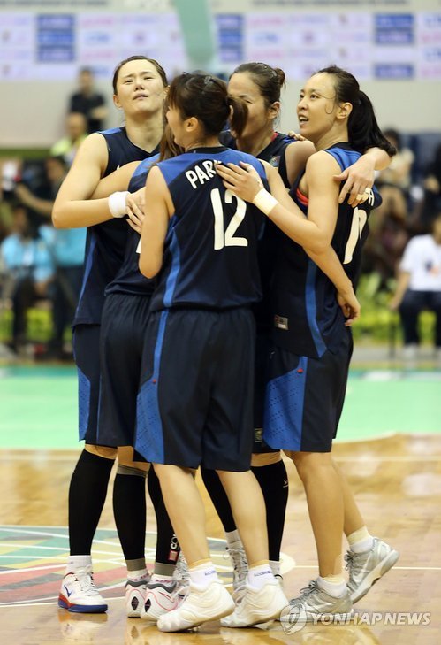 | 아시아여자농구, 한국 결승 진출 2일 태국 방콕에서 열린 아시아 여자농구 선수권대회 준결승 한국 대 중국의 경기에서 71대66으로 승리를 거둔 한국 선수들이 기뻐하고 있다. |