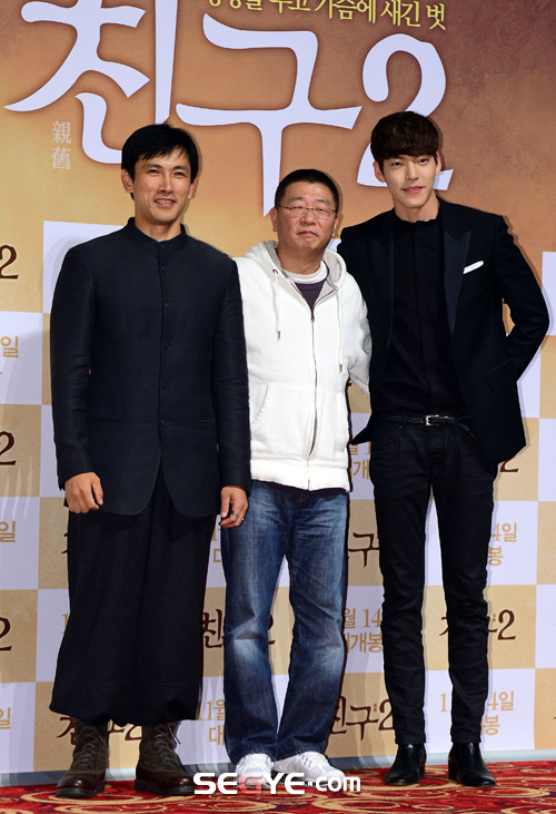 배우 유오성, 곽경택 감독, 김우빈이 4일 오후 서울 롯데시네마 건대점에서 열린 영화 '친구2' 언론시사회에 참석해 포즈를 취하고 있다.