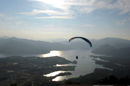 | 제천 비봉산 정상에 서면 사방으로 청풍호 전체의 모습이 펼쳐진다. 하늘을 나는 패러글라이더가 이 풍경을 더욱 짜릿하고 역동감 있게 만들어 준다. |