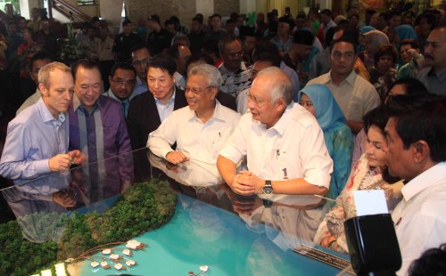 | 세인트 레지스(St. Regis) 호텔 랑카위 & 컨벤션 센터 기공식에 참석한 주요 인사들이 랑카위 개발 모형도를 보고 있다. 피터 손닥 라자왈리그룹 회장(왼쪽 첫번째), 쌍용건설 김석준 회장(〃두번째), 재무부 2장관(〃네번째), 나집 수상(〃다섯번째). 쌍용건설 제공 |