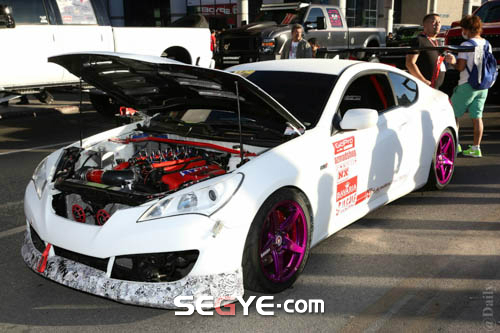 겉으로 봐서는 튜닝 내용을 알 수 없는 제네시스 쿠페도 세마쇼 행사장 곳곳에서 눈에 띄었다. 행사장 바깥 주차장 공간에 마련된 야외 전시장에는 흰색 차체에 보라색 휠을 장착하고 커다란 리어스포일러를 더한 제네시스 쿠페가 눈길을 끌었다. 당장에라도 서킷으로 달려들어갈 기세다. 튜닝을 자랑하기 위해 보닛을 열어놓았는데 엔진룸 곳곳을 빨간색으로 튜닝해 강렬한 인상을 남겼다. 바퀴는 바바리아의 휠과 함께 브램보 브레이크를 장착했고 보닛은 엔진 열기를 빼내기 위해 상어 아가미 형태로 개조했다. 실내는 더욱 화려하다 스파르코 버킷 시트를 장착하고 드리프트를 위해 사이드 브레이크 레버를 길게 올렸다. 달리다가 언제든 당기면 바퀴를 미끄러트리며 돌아갈 수 있다.