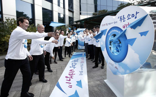 한국베링거인겔하임과 한국릴리 임직원들이 12일 서울 남대문로 한국릴리 본사에서 당뇨병 극복 의지를 담은 ‘푸른 소망 비행기’를 날리고 있다. 14일은 유엔(UN)이 정한 ‘세계 당뇨병의 날’로 우리나라를 포함한 세계 160여개국에서 당뇨병 없는 건강한 사회를 염원하는 다양한 행사가 열린다.