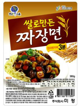 ㈜미정의 ‘쌀짜장면(사진)’은 물에 끓일 필요 없이 전자레인지를 이용해 간편한 조리가 가능하다. 면을 용기에 넣은 후 면이 잠길 정도로 물을 부은 다음 전자레인지에서 온수는 3∼4분, 냉수는 5∼6분 조리한 뒤 물을 버리고 소스를 부어 비벼 먹으면 된다. 쌀 함량이 80%인 ‘쌀짜장면’은 쌀면 고유의 쫄깃쫄깃함이 짜장 소스와 어우러져 밀가루면보다 식감이 뛰어나다.