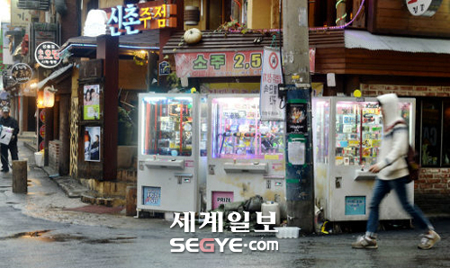 | 12일 서울 신촌역 주변 먹자골목에 고가의 완구류로 가득 채워진 경품뽑기 게임기가 놓여 있다. 게임기 운영업자들은 수입을 올리기 위해 내부 기판을 조작하는 등의 방식으로 뽑기 확률을 낮추기도 한다. 김범준 기자 |