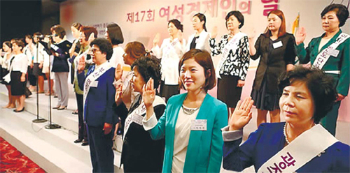 | 지난 7월 서울 여의도 중소기업중앙회에서 열린 여성경제인의 날 기념식에서 여성 최고경영자(CEO) 선후배들이 멘토·멘티 선포식을 하고 있다. 세계일보 자료사진 |