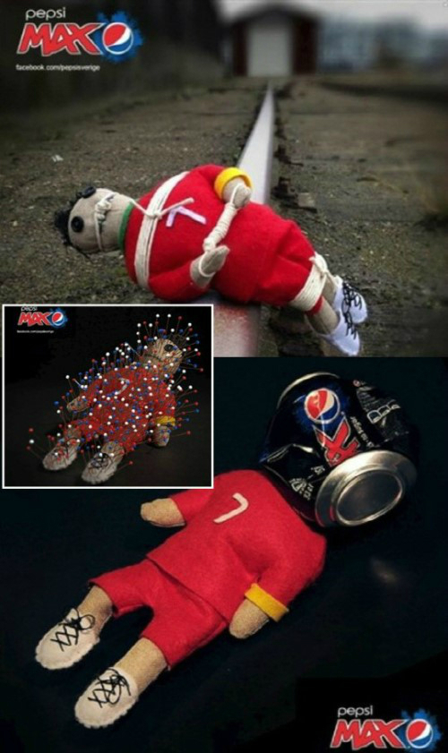 누가 봐도 해당 인형이 포르투갈 유니폼을 입은 호날두를 형상화한 것이 분명한 상황. 20일 포르투갈과 스웨덴의 2014년 브라질 월드컵 유럽지역 예선 플레이오프 2차전을 앞두고 펩시가 자사 모델 리오넬 메시(바르셀로나)를 응원하기 위해 라이벌인 호날두 인형을 제작, 저주를 퍼붓는 사진을 게재한 것이다.