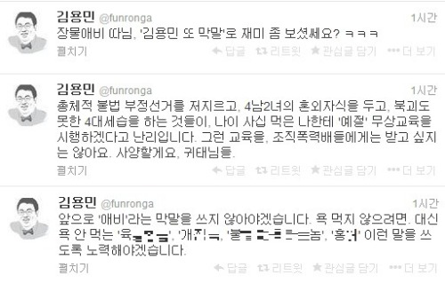 또한 김씨는 "앞으로 '애비'란 막말을 쓰지 않아야겠다"며 "대신 욕 안 먹는 '육XXX', '개XX', '불XX XXX 놈', '홍X' 이런 말을 쓰도록 노력해야겠다"고 덧붙였다.