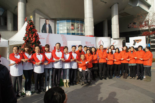 지난해 개최된 ‘세계 에이즈의 날’ 행사에서 붉은색 옷을 입은 참가자들이 ‘레드리본’ 모양으로 손을 맞잡고 시민들에게 에이즈 예방에 대한 관심을 촉구하고 있다.