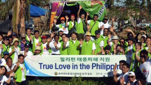세계평화통일가정연합 유경석 한국회장과 용정식 아시아대륙회장은 27, 28일 이틀에 걸쳐 태풍 ‘하이옌’으로 막대한 피해를 입은 필리핀 세부 지역 보고시 등을 방문해 한학자 총재가 기탁한 100만달러(약 10억6000만원)로 생필품을 구입해 피해지역 주민들에게 전달했다. 또 한국 신도들이 기부한 성금 20만달러를 직접 전달하는 등 긴급 구호봉사단과 함께 봉사활동을 펼쳤다.