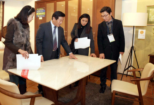| 에몬스가구 김경수 회장(왼쪽에서 두 번째)이 2014 S/S 가구트렌드 발표회 및 신상품 품평회에서 고객들에게 신제품의 특성을 설명하고 있다. |