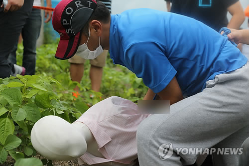 | 내연녀를 살해한 전북 군산경찰서 정완근(40) 경사가 8월 3일 군산시 회현면에서 열린 현장검증에서 시신 유기 범행을 재연하고 있다. |