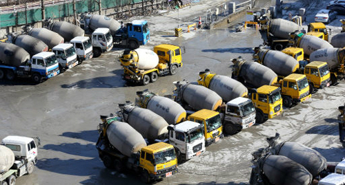 | 전국철도노동조합의 파업이 닷새째 이어진 13일 시멘트 수급에 어려움을 겪고 있는 경기 안양의 한 레미콘 공장에 발이 묶인 레미콘 차량들이 줄지어 멈춰 서 있다. 안양=연합뉴스 |