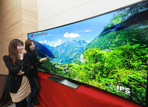 | LG전자가 19일 세계 최초로 공개한 ‘105형 곡면 울트라HD TV’를 배경으로 모델이 포즈를 취하고 있다. LG전자 제공 |