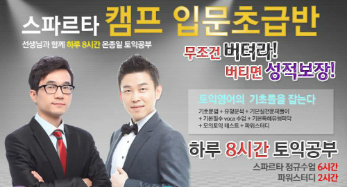 또한 쿠키어학원의 스파르타토익캠프는 오전 10시~오후 5시까지 정규수업과 2시간의 파워스터디가 진행된다. 하루 8시간 스파르타캠프에는 독해·voca·문제풀이수업을 정규수업에 편성해 온종일 선생님과 함께 공부하는 것이 눈길을 끈다.