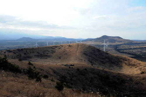 능선에 놓인 돌탑을 지나 정상에 오르면 왜 따라비 오름을 ‘제주 오름의 여왕’이라고 부르는지 단번에 수긍이 간다. 따라비오름은 원형으로 된 큰 분화구가 마치 새끼를 품고 있듯 작은 분화구 3개를 품고 있다. 이 분화구 3개의 능선이 부드럽고 완만한 곡선을 그려낸다. 이 능선을 따라 걸으며 주변을 조망하는 게 따라비오름에서 놓칠 수 없는 즐거움이다. 정상에서 내려보다는 전망도 빼어나다. 너른 초원지대와 그 위에 조성된 풍력발전단지, 그리고 사방에 봉긋하게 솟은 오름, 그 뒤편의 푸른 바다가 어우러져 그림 같은 풍경을 만들어낸다.
