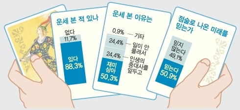27일 세계일보가 취업포털 ‘잡코리아’와 함께 직장인 394명을 대상으로 벌인 설문조사에서 88.3%가 ‘사주·궁합·토정비결·타로점 등 운세를 본 적이 있다’고 답했다.