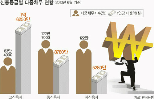 그는 도중에 정부의 채무조정 프로그램을 이용했지만 중도에 탈락해 화를 키웠다. 결국 희망모아·신용회복기금 등도 원금 2319만원에 3470만원의 이자가 불었다. 중도탈락 때 감면받았던 원리금이 되살아나고 연체이자가 적용됐기 때문이다. 그동안 은행들은 연체 때 신용도에 따라 연 17∼19%의 금리를 적용해왔다. 카드사와 저축은행 등 2금융권은 각각 29∼32%의 고금리를, 대부업체 등은 39%대의 금리를 물린 것으로 전해진다.