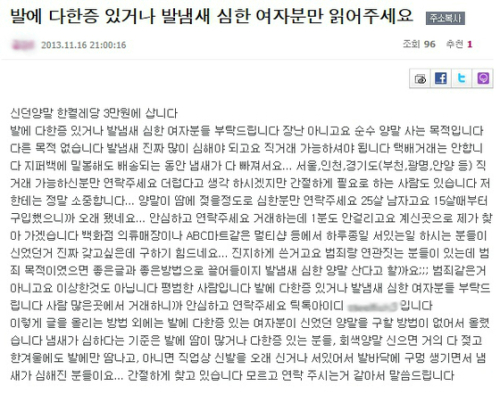 글쓴이는 "발에 다한증 있거나 발냄새 심한 여자분들 부탁드립니다. 장난 아니고 순수 양말 사는 목적입니다. 발냄새 진짜 많이 심해야 되고 직거래 가능하셔야 됩니다"라며 "더럽다고 생각하시겠지만 간절하게 필요로 하는 사람도 있습니다. 저한테는 정말 소중합니다"라고 구매 목적을 밝혔다.