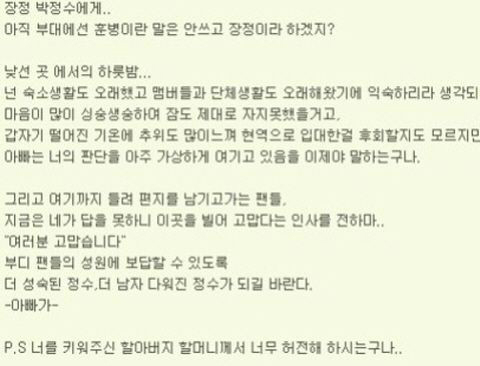 '장정 박정수에게'라는 제목으로 시작하는 이 편지글에서 이특의 아버지는 "낯선곳에서의 하룻밤, 갑자기 떨어진 기온에 추위도 많이 느껴 현역으로 입대한 걸 후회할지도 모르지만 아빠는 너의 판단을 아주 가상하게 여기고 있음을 이제야 말한다"며 아들을 기특해했다.