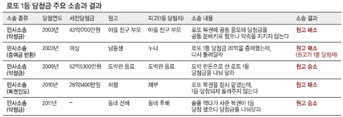 로또 1등 당첨금을 두고 벌어진 민형사와 가사 소송 12건의 키워드(주제어)다. ‘나중에 꼭 당첨금을 나눠 갖자’던 로또 계원들 간의 약속은 지켜지지 않았고, 빌린 돈을 갚기 싫어 1등 당첨 사실을 감추다가 들통이 나기도 했다. 하늘에서 떨어진 ‘일확천금’은 가족도 갈라놓았다. 누나와 동생, 처형과 제부가 소송을 벌이고, 이혼한 부부가 법정에서 다시 만나 감정의 골이 깊어진 사례도 있었다. 그럼에도 누적 당첨자 수에 비해 소송으로 이어진 경우가 극히 드물어 ‘로또 당첨의 끝은 불행’이라는 세간의 속설이 허구임을 보여줬다.
